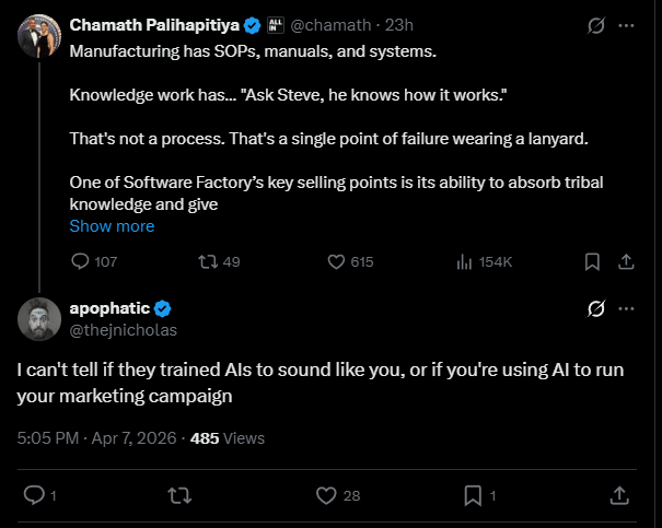 I was three scrolls into an X session I had already promised myself I wouldn’t have when Chamath Palihapitiya appeared on my screen and said something about manufacturing having SOPs and knowledge work having Steve, and Steve is a single point of failure wearing a lanyard, and I stopped scrolling because the sentence sounded like something I had heard before. Not the content. The shape. The way each paragraph did exactly one thing and then stopped and the next paragraph did one thing and then stopped and the rhythm was declaration, pause, pivot, sell. Declaration, pause, pivot, sell. The man was typing in iambic pentameter for venture capitalists and 154,000 people were watching and I was trying to figure out why a billionaire’s X post sounded like it had been generated by the same thing I use to outline my novel.